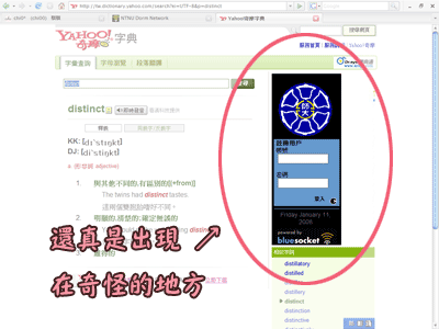 Fig 1: 「師大無線網路登入區塊」出現在廣告欄位師大無線網路不必在Yahoo!字典買廣告吧……